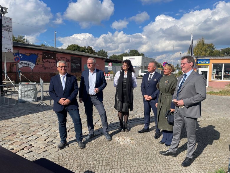 Teilnehmer der Feierlichkeiten: Bürgermeister Michael Schwuchow (l.), Bürgermeister Uwe Bruchhäuser (2. v.l.), Bürgermeister Antanas Kalnius mit Ehefrau Ruta (3.u.2. von rechts), Thomas Mottner (r.), Vorsitzender des Gemeinderates von Blankenfelde-Mahlow.
